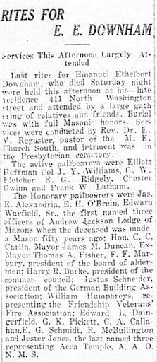 | E.E. DOWNHAM beloved husband of SARAH M. DOWNHAM 1839 – 1921 P.M. of A. J. Lodge No. 120, A.F. & A. M. P.G.C. of Grand Commander, VA Rep. of Acca Tample 23 years Emeritus memnber of the Imperial Counci of A.A.O.N.M.S of North America SARAH M. DOWNHAM beloved wife of E.E. DOWNHAM 1845 – 1937 |