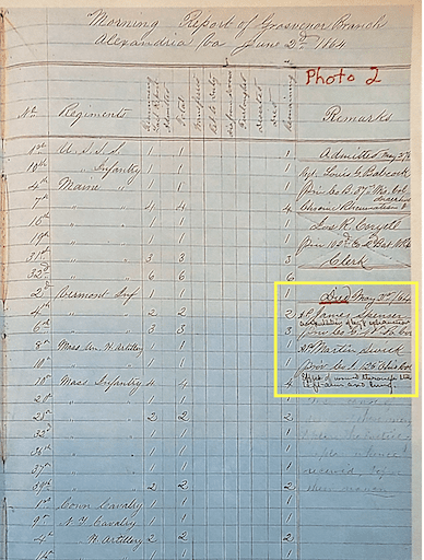 At some point during his service, Metlock was injured or fell ill and was likely sent to Camp Convalescent near Alexandria, Virginia. This camp was established to care for recovering soldiers who were not well enough to return to their units but no longer required hospitalization. Many of the men who spent time at Camp Convalescent later joined the Veteran Reserve Corps (VRC), a unit established to utilize partially disabled soldiers for light-duty tasks.