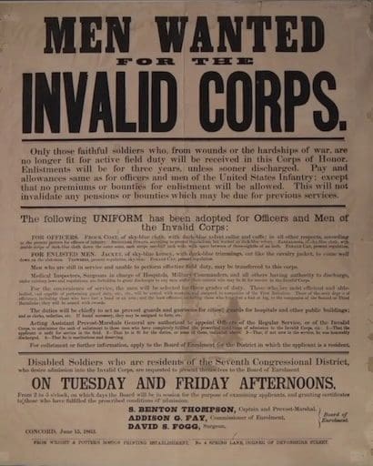 This recruiting poster, sourced from the National Library of Medicine’s online exhibition “Life and Limb: The Toll of the American Civil War” (https://www.nlm.nih.gov/exhibition/lifeandlimb/honorablescars.html), showcases the Invalid Corps, which was later renamed the Veteran Reserve Corps.