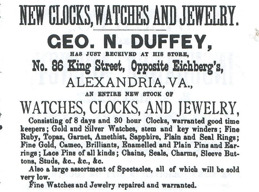 After the war, Duffey resumed his role in the family’s jewelry enterprise. He was honored with the position of Chief Marshall during Alexandria’s Centennial parade on March 9, 1880, and served as Commissioner of the Revenue for the City.