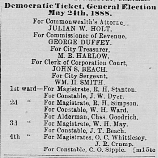15 May 1888, Tue · Page 3 of the slate of nominees for the Democratic Ticket during the May 24, 1888 city elections.