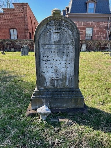 | Our Brother WILLIAM H. KING Was Killed by the explosion of the Engine Harrisonburg March 28, 1870 Aged 26 years. In the midst of Life we are in death. |