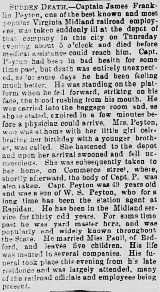 Captain Peyton, born on September 24, 1840, and deceased on July 3, 1890, is interred at Washington Street (Union) Cemetery, just a short distance from King Street. Peyton’s unexpected death occurred while employed with Virginia Midland Railroad, previously known as O&A Railroad, before merging with Lynchburg and Danville Railroad in 1872. Peyton’s obituary provides further details, but the subsequent events of Murphy’s life remain unknown.