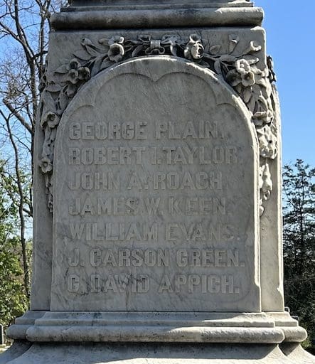 The explosion’s shock delayed the bodies’ recovery for several hours. Those killed were Evans, G. David Appich (buried in the Presbyterian), J. Carson Green (buried in Christ Church), John Roach (buried in St. Mary’s), George Plain (buried in Methodist Protestant), Robert Taylor (buried in Methodist Protestant), and James Keene (buried in Methodist Protestant).