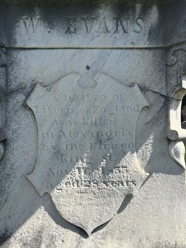 | WM. E. EVANS A native of Liverpool, England was Killed in Alexandria by the Fire on King St. Nov. 17th 1855 aged 28 years Erected to his memory by his brother & sister Thos. & Esabell Evans |