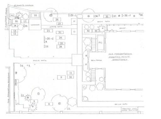 The churchyard burial ground, located north and west of the Presbyterian Meeting House, was the primary burial site for Alexandria’s Presbyterians from the town’s founding until 1809. The oldest grave in the burial ground belongs to Sarah Fairfax Carlyle, who died in 1761, predating the establishment of the formal Presbyterian congregation in 1772 and the completion of the original meeting house in 1775.