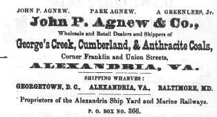 Park Agnew’s influence extended to various industrial sectors. He played a pivotal role in the Alexandria Marine Railway and Ship Building Co., serving as its president. The company’s yard and wharves at the south end of Union Street became a hub of maritime activity under his leadership. Additionally, he managed the Sinclair and Agnew Gas and Coal Co., effectively continuing his family’s coal business. This venture thrived during the 1880s along the Georgetown, Alexandria, and Baltimore waterfronts.