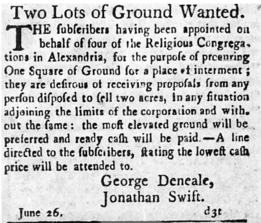 Faced with these challenging circumstances, city officials and religious leaders sought to establish new burial grounds outside the crowded and unsanitary conditions of the residential areas. The Wilkes Street Cemetery Complex emerged as a solution. Alexandria’s four religious congregations tasked George Deneale, senior warden at Christ Church, and Jonathan Swift to procure a suitable burial site.
