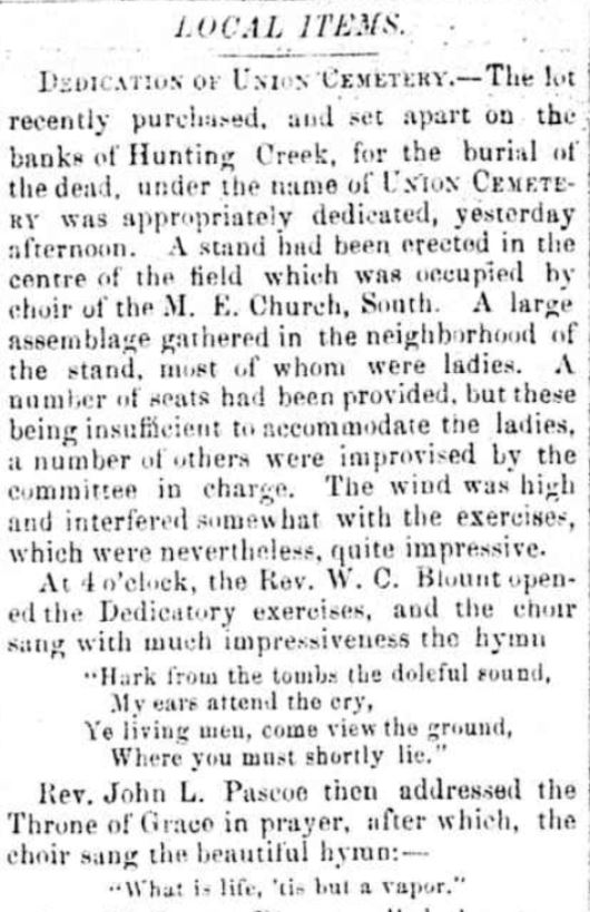 On September 12, 1860, Union Cemetery Alexandria Virginia was dedicated in a ceremony led by Reverend William Blount. Church members, the choir, and the Mount Vernon Guards attended the event after a long sermon by Reverend Blount. The local newspaper, the Alexandria Gazette and Virginia Advertiser, covered the dedication, noting that “the wind was high and interfered somewhat with the exercises, which were, nevertheless, quite impressive.”